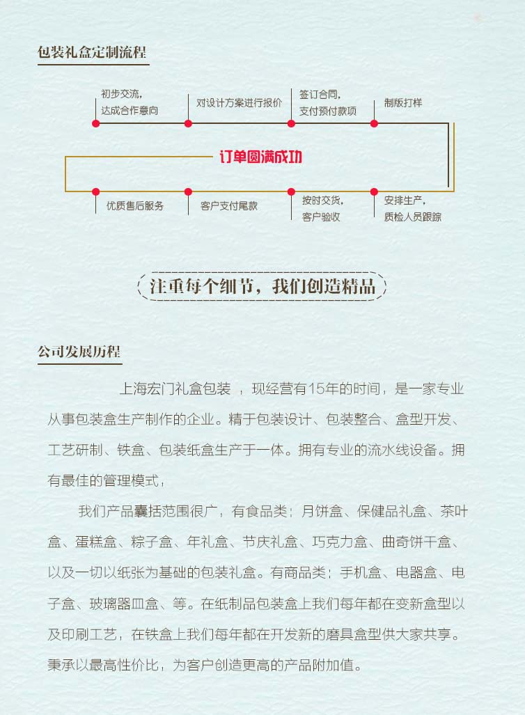 上海宏門禮盒包裝,現(xiàn)經(jīng)營有15年的時(shí)間,是一家專業(yè)從事包裝盒生產(chǎn)制作的企業(yè)。精于包裝設(shè)計(jì)、包裝整合、盒型開發(fā)、工藝研制、鐵盒、包裝紙盒生產(chǎn)于一體。擁有專業(yè)的流水線設(shè)備。擁有最佳的管理模式, 我們產(chǎn)品囊括范圍很廣,有食品類:月餅盒、保健品禮盒、茶葉盒、蛋糕盒、粽子盒、年禮盒、節(jié)慶禮盒、巧克力盒、曲奇餅干盒、以及一切以紙張為基礎(chǔ)的包裝禮盒。有商品類:手機(jī)盒、電器盒、電子盒、玻璃器皿盒、等。在紙制品包裝盒上我們每年都在變新盒型以及印刷工藝,在鐵盒上我們每年都在開發(fā)新的磨具盒型供大家共享。秉承以最高性價(jià)比,為客戶創(chuàng)造更高的產(chǎn)品附加值。